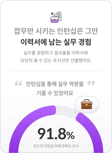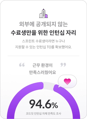 스프린트 단기 심화 과정 커리큘럼 뿐만 아니라 취업 지원 프로그램을 통해 이력서 작성에 큰 도움을 받았어요. - 수료생 K님